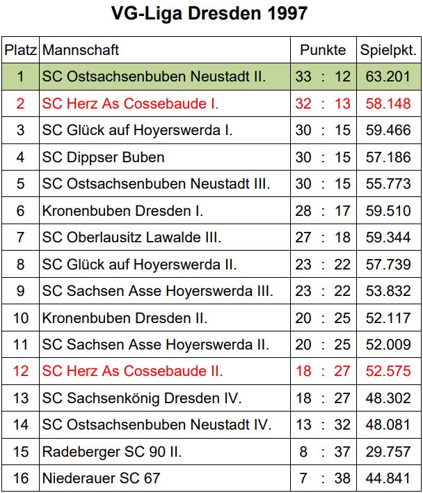 Im Ligaspielbetrieb nehmen wir mit zwei Mannschaften in der VG-Liga Dresden teil und schließen mit dem 2. und 12. Platz ab. Trotz eines 8:1 am letzten Spieltag reicht der Vize-Meistertitel der 1. Mannschaft mit einem 32:13 leider nicht zum Aufstieg, da in diesem Jahr nur der Erstplatzierte in die Sachsenliga aufsteigt.