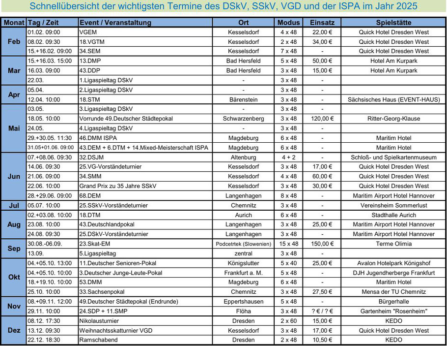 Der Deutsche Skatverband richtet den 3. Deutschen Junge-Leute-Pokal am 4.+5. Oktober 2025 in der DJH Jugendherberge Frankfurt in Frankfurt am Main aus. Startberechtigt sind alle, die zwischen 18 und 40 Jahre alt sind. Es werden am Samstag drei und am Sonntag zwei Serien jeweils á 48 Spiele gespielt. Am Samstag geht es um 10:00 Uhr los und am Sonntag um 9:30 Uhr.